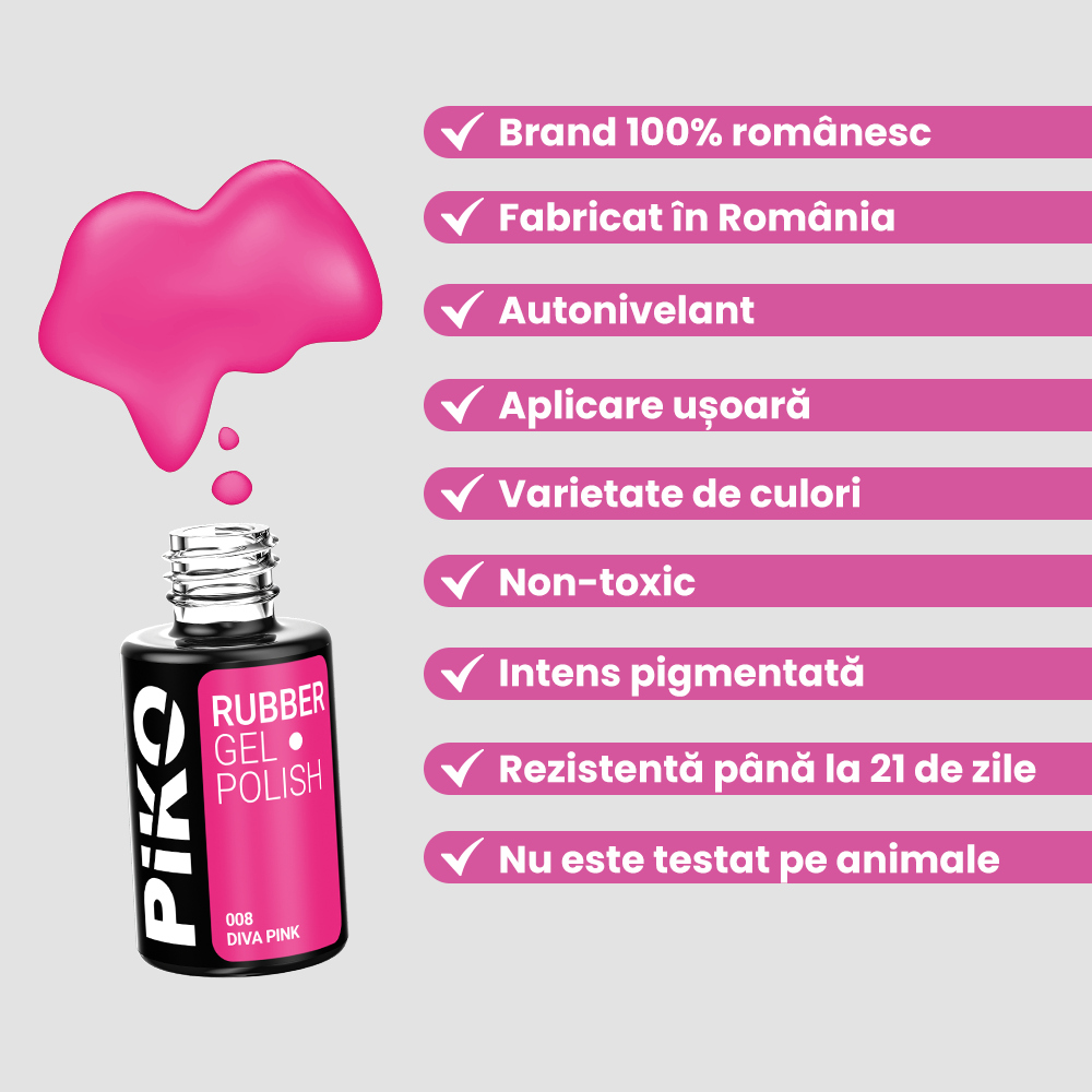 Oja semipermanenta cu extra intensitate a culorii si aplicare dintr-un singur strat. Are textura autonivelanta, vascozitate ridicata si un miros subtil. In plus, vei economisi si mai mult timp in procesul de realizare al manichiurii deoarece nu necesita aplicarea unei baze. Lasa-te cucerita de oja semipermanenta Piko Rubber.
