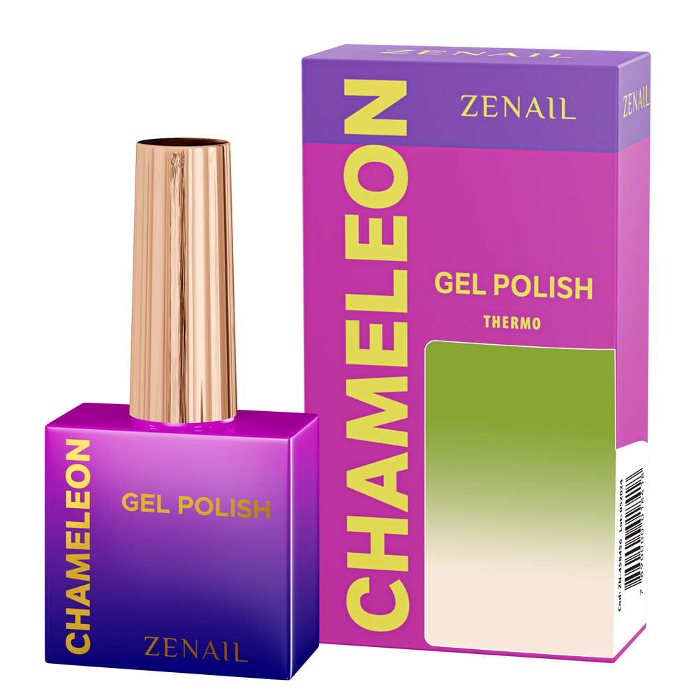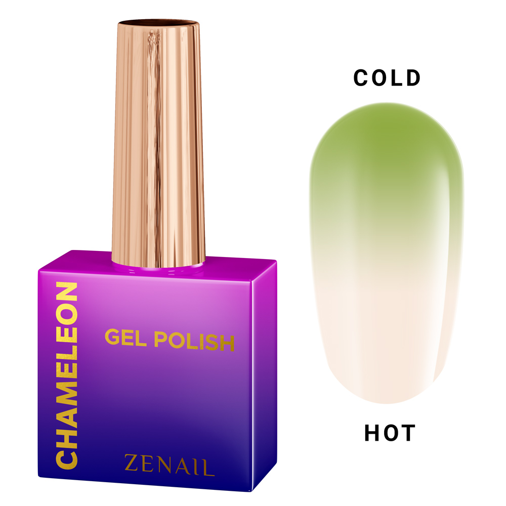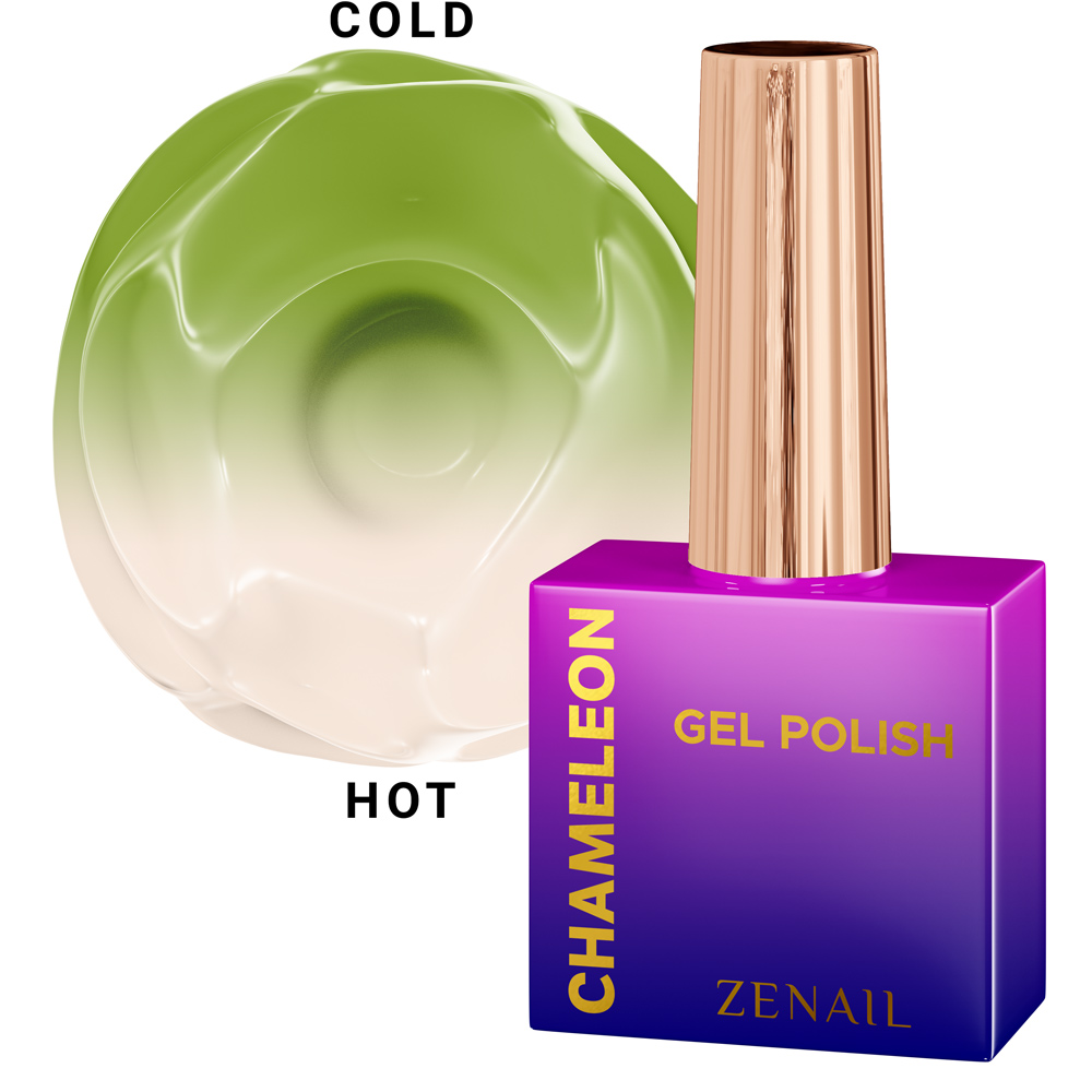 Oja semipermanenta Chameleon thermo ZENAIL, realizata din rasini cu uscare UV, cu o schimbare magica de culoare care depinde de schimbarea temperaturii. Datorita pigmentilor termosensibili din microcapsule care schimba culoarea in mod reversibil.