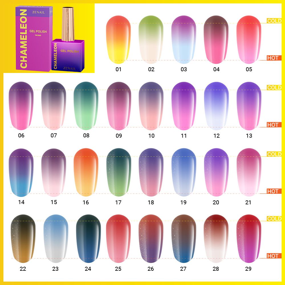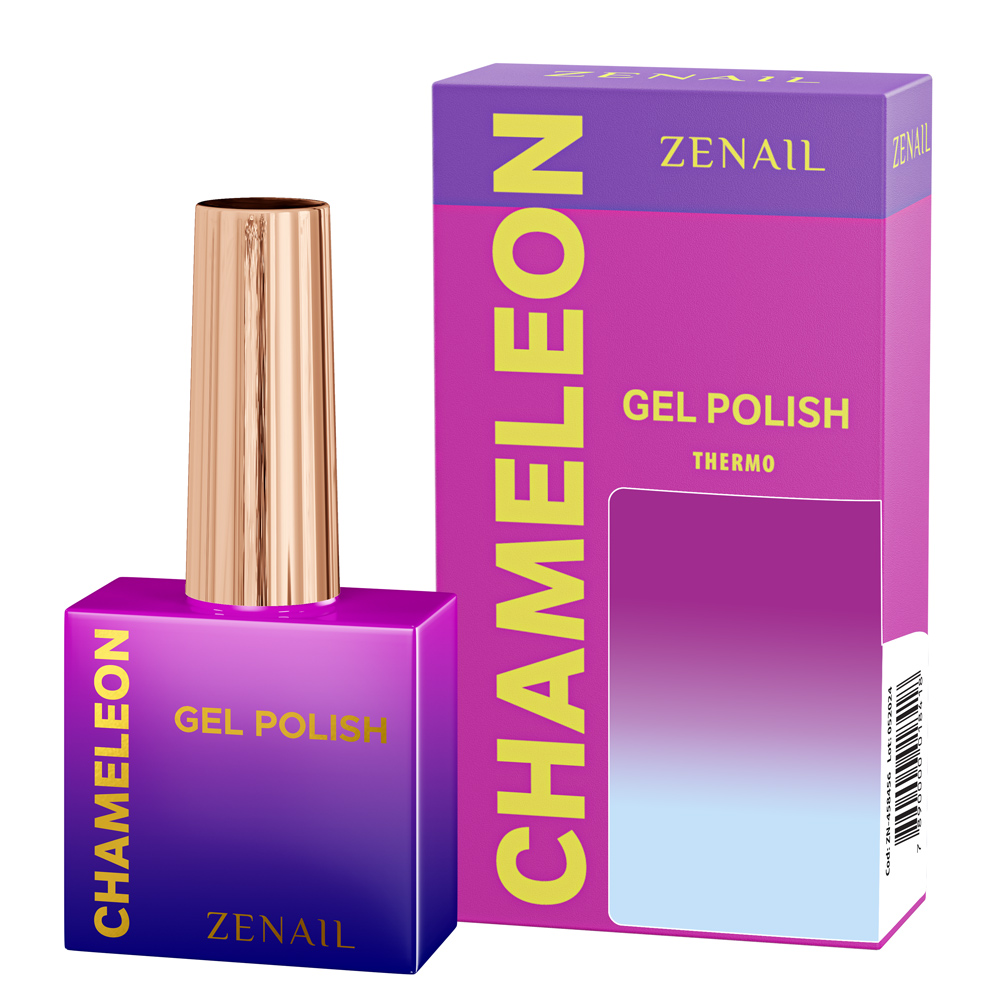 Oja semipermanenta Chameleon thermo ZENAIL, realizata din rasini cu uscare UV, cu o schimbare magica de culoare care depinde de schimbarea temperaturii. Datorita pigmentilor termosensibili din microcapsule care schimba culoarea in mod reversibil.
