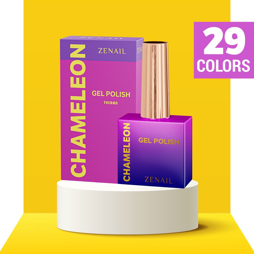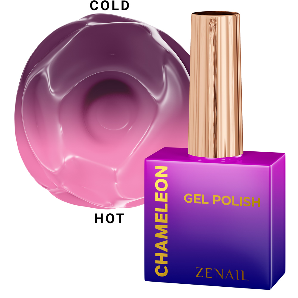Oja semipermanenta Chameleon thermo ZENAIL, realizata din rasini cu uscare UV, cu o schimbare magica de culoare care depinde de schimbarea temperaturii. Datorita pigmentilor termosensibili din microcapsule care schimba culoarea in mod reversibil.