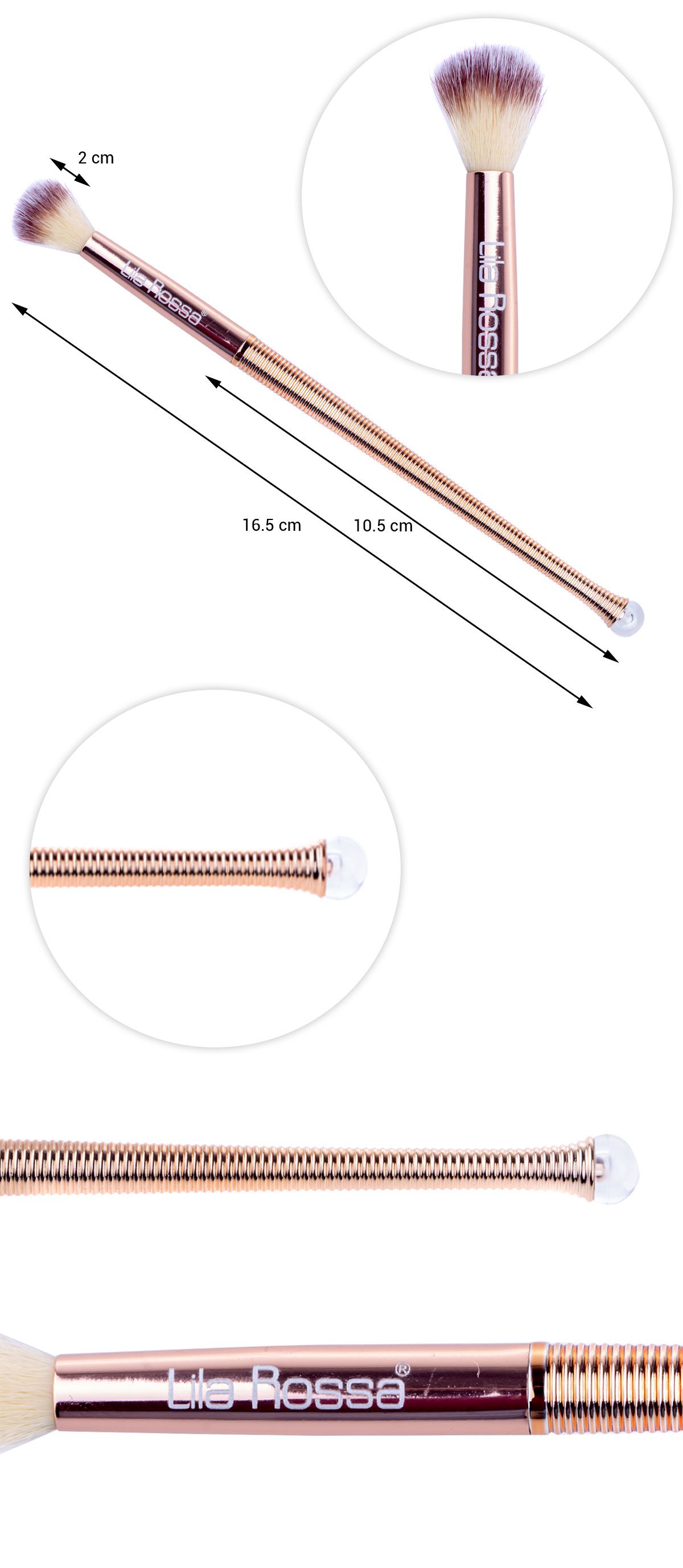 Este fabricata din par sintetic de inalta calitate, fiind foarte blanda cu piele si neprovocand iritatii. Disperseaza uniform produsul. Dimensiunea iti permite blenduirea perfecta pe pleoapa superioara. Greutatea optima si designul ergonomic iti permit o manevrare cat mai usoara.