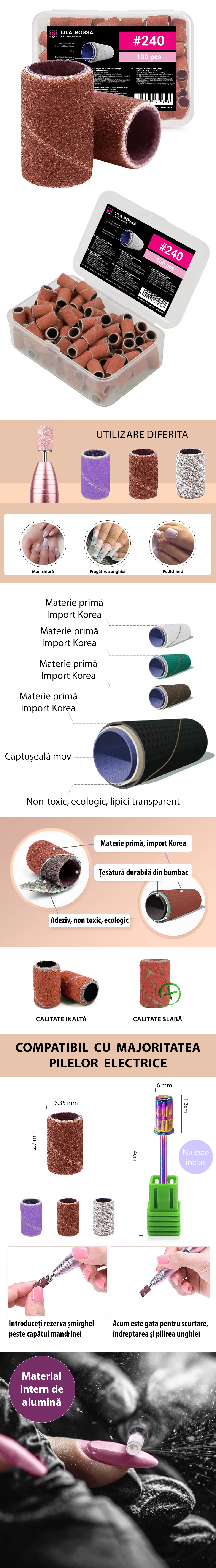 Rezerve smirghel pentru pila electrica sunt potrivite pentru pilirea, lustruirea si finisarea manichiurilor. Astfel, inelele abrazive se pot folosi la manichiura cu acryl, gel UV, oja semipermanenta, pe tipsuri sau unghii naturale. Aceste capete smirghel au granulatii diferite #240, ceea ce va ajuta la realizarea unor manichiuri / pedichiuri complete. Capetele usor abrazive se folosesc la finisarea manichiurilor, pe cand cele foarte abrazive la indepartarea gelului, acrylului sau polygelului.